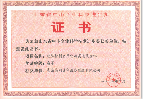 賀青島海剛燙印設(shè)備制造有限公司貨山東省中小企業(yè)科技進(jìn)步獎(jiǎng)